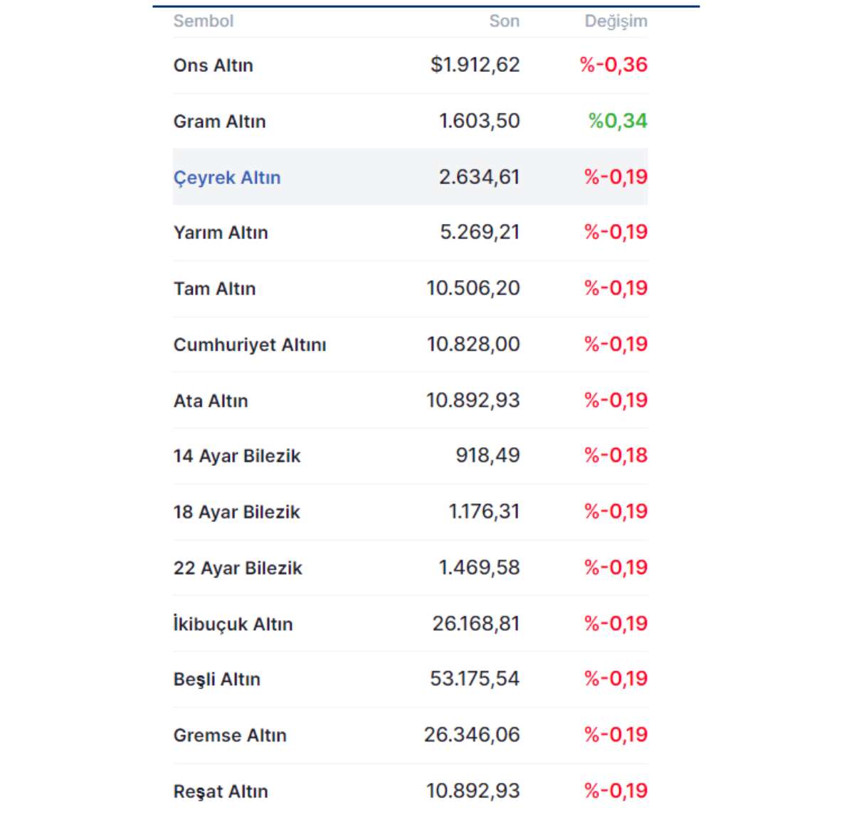 Altının gram fiyatı, yeni haftaya düşüşle başlamasının ardından saat 14.40 itibarıyla 1.603 liradan işlem görüyor. Aynı dakikalarda çeyrek altın 2.634 lira, Cumhuriyet altını da 10.828 liradan satılıyor.