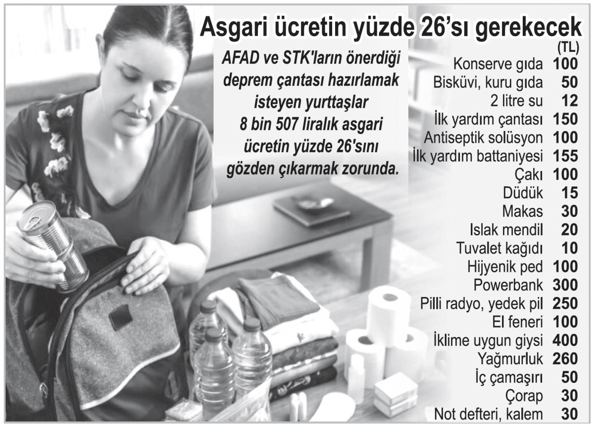 Deprem için hazırlanacak çantanın içeriği AFAD sitesinde yer alıyor. Bu çantada tapu, sigorta poliçesi, araç ruhsatı ve kimlik gibi belgelerin yanı sıra birçok sabit ürün bulunuyor. Afet anında hayat kurtaracak malzemelerin bulunduğu çantaya ulaşmak bir hayli güç. İnternette çok az kanalda satılan çantaya hazır halde sokak mağazalarından ulaşılamıyor. Yurttaşlar bu ürünleri tek tek satın alarak bir araya getirmek zorunda. İstanbul’da perakende ticaretin kalbi olan Sirkeci ve Eminönü’nde bile malzemeleri bir araya getirmek zor. Maliyeti ise asgari ücretin dörtte biri. Türkiye Mimar ve Mühendisler Odaları Birliği (TMMOB) Jeoloji Mühendisleri Odası başkanı Hüseyin Alan, bu çantaların deprem sonrası çok büyük bir ihtiyacı karşıladığını belirterek “Hanelere zorunlu DASK yapmakla yetkilendirilmiş kurumlar bu çantaları sigorta ettikleri her eve birer tane verebilirler. Ailenin acil ihtiyacını karşıladığı gibi kurtarma ekiplerine ulaşılmasını da kolaylaştırıyor ve hayata tutunmayı sağlıyor” dedi.