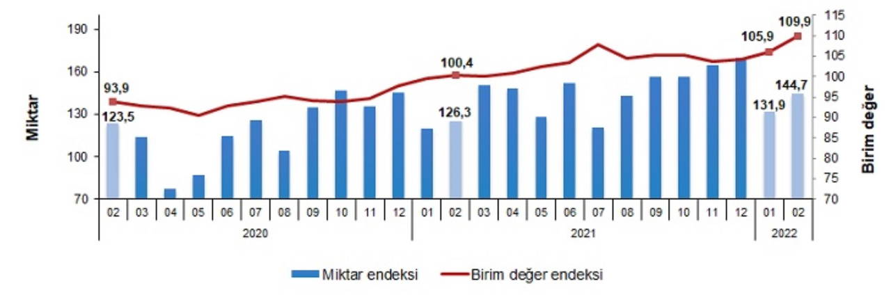 İhracat birim değer ve miktar endeksleri, Şubat 2022