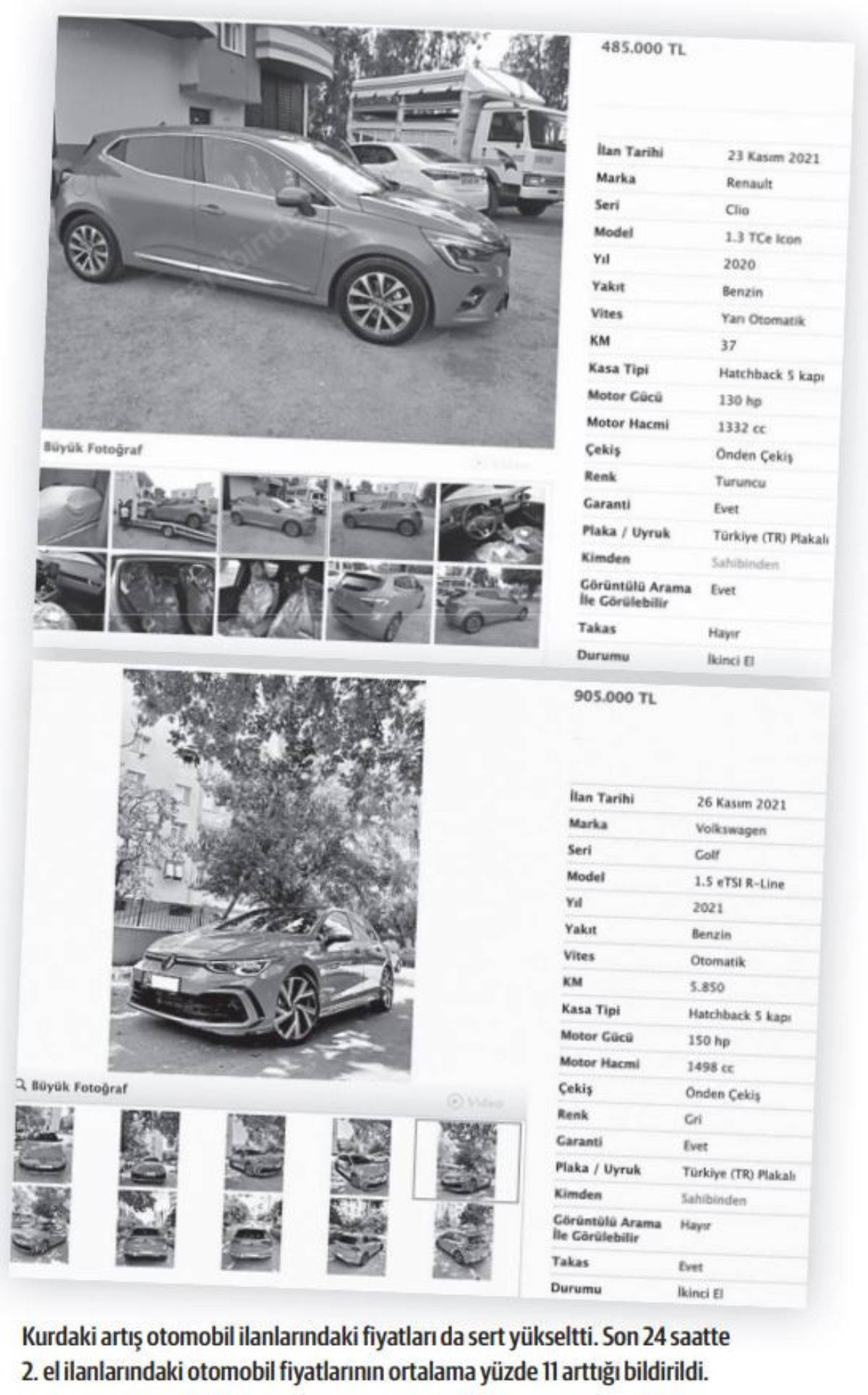 Piyasada bir süredir devam eden bu durum, 23 Kasım’da kurda yaşanan ani yükselişle adeta zirve yaptı. 23 Kasım’da dolar/TL kuru, 13’ü aşarak rekor tazelerken, Euro/TL ise 15 seviyesine çıkmıştı. Fiyatların artacağı beklentisi ile ev ve araba ilanları online ilan platformlarından çekilmişti. Panik havasını atlatan tüketici, yeniden aracını ilan sitelerine koydu. Ancak bu kez çok daha yüksek bir fiyatla. Sadece son 24 saat içerisinde sahibinden. com’da 41 bin aracın fiyatı güncellendi. İkinci elde son bir haftada ortalama yüzde 16 fiyat artışı yaşandı. Ancak online sitelerde bu oran çok daha yüksek oldu. Türkiye’nin en ulaşılabilir araçlarından biri olarak görülen 2020 model Renault Clio’yu 485 TL’den ilana koyan var. En donanımlı 2021 model Clio’nun liste fiyatı 355 bin TL. Yine benzer şekilde piyasada en çok tercih edilen modellerden Volkswagen Golf’ü dün 900 bin TL’den ilana koyan oldu. Bu aracın bayideki liste fiyatı ise 585 bin TL. Buna benzer örneklerin giderek çoğaldığı dikkat çekiyor.