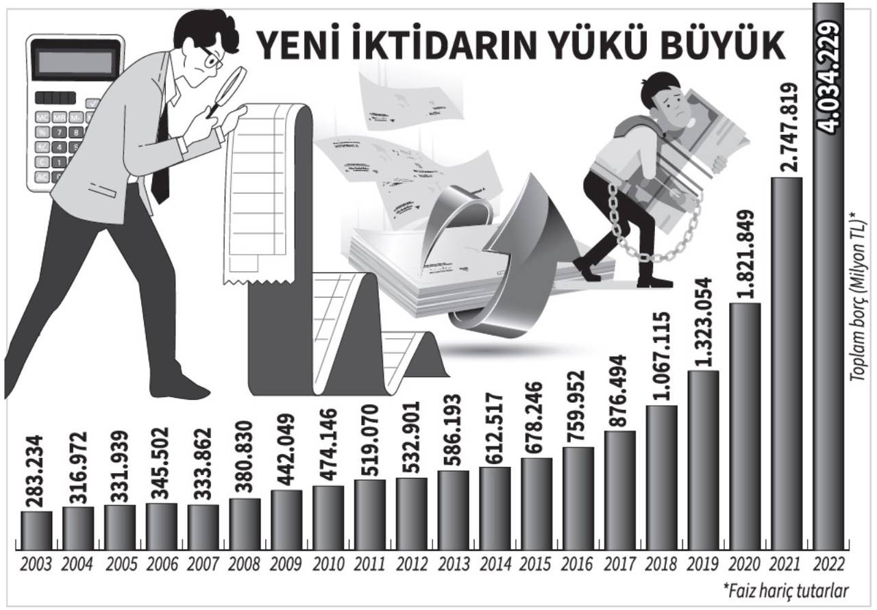 Seçime sayılı günler kala iktidarın yarattığı borç sarmalı, Hazine üzerindeki baskıyı artırıyor. Hazine ve Maliye Bakanlığı’nın iç ve dış borç ödeme projeksiyonlarına göre 14 Mayıs sonrasında kurulacak yeni kabineyi 2023 Mayıs-Eylül döneminde 632 milyar TL (27.2 milyar dolar), toplamda ise 7.8 trilyon TL (209 milyar dolar) borç ödemesi bekliyor.