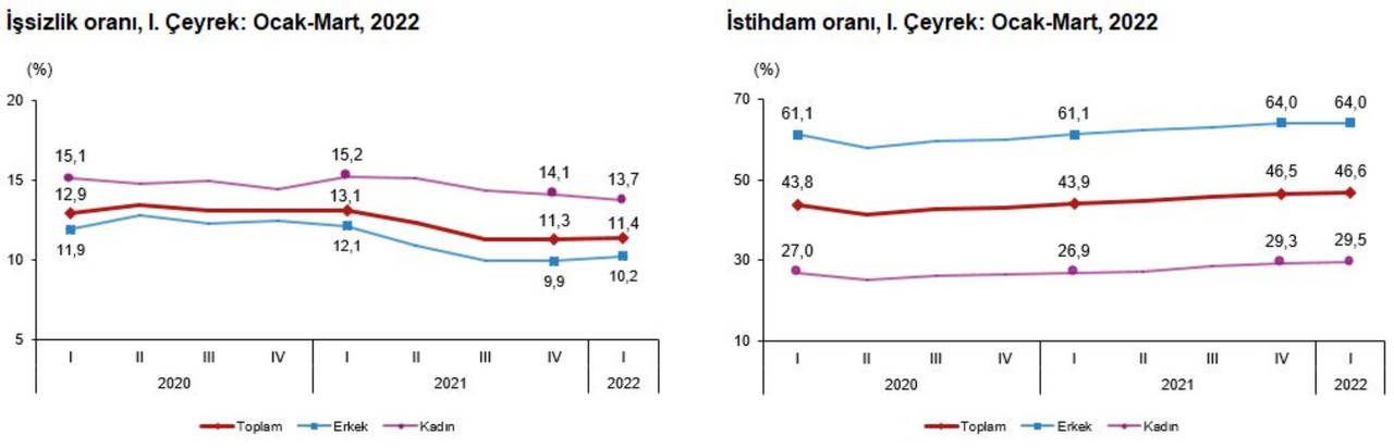 İstihdam edilenlerin sayısı 2022 yılı birinci çeyreğinde bir önceki çeyreğe göre 188 bin kişi artarak 29 milyon 964 bin kişi, istihdam oranı ise 0,1 puanlık artışla yüzde 46,6 oldu. Bu oran erkeklerde yüzde 64 iken kadınlarda yüzde 29,5 olarak gerçekleşti.