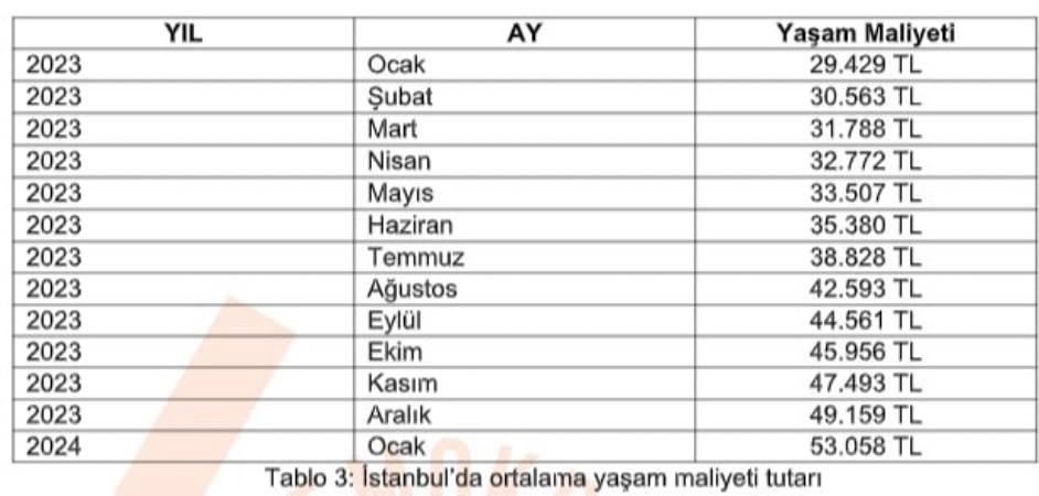İstanbul’da yaşamanın maliyeti geçen yılın aynı ayına göre yüzde 80,29 arttı. İstanbul’da dört kişilik bir ailenin ortalama yaşam maliyeti 53.058 lira olarak hesaplandı.