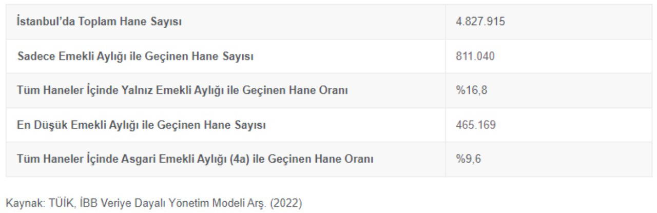 Raporda, İstanbul’da aktif çalışan bir birey olmayan ve sadece emekli aylığı ile geçinen 811.040 hanenin olduğu ölçüldü. Sadece emekli aylığı ile geçinen hane oranı ise tüm haneler içerisinde yüzde 16,8 olarak hesaplandı. Her 10 haneden 1’inin ise en düşük emekli aylığı ile geçinen emekli haneler olduğu görüldü.