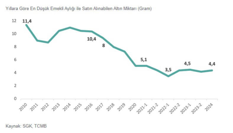 Rapora göre, 2010 yılında en düşük emekli aylığıyla 11,4 gram altın veya 453 dolar alınabilirken günümüzde bu durum 4,4 gram altın veya 319 dolara geriledi.