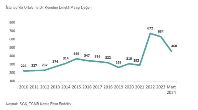 İstanbul’da 100 m2‘lik ortalama bir konut fiyatı 2010 yılında 224 emekli maaşına denk gelirken 2022 yılında 672 emekli maaşına yükselmiştir. Geçtiğimiz iki yılda konut fiyatlarının yükseliş hızındaki azalma sebebiyle günümüzde 100 m2’lik bir konut fiyatı 460 adet en düşük emekli maaşına denk gelmektedir.