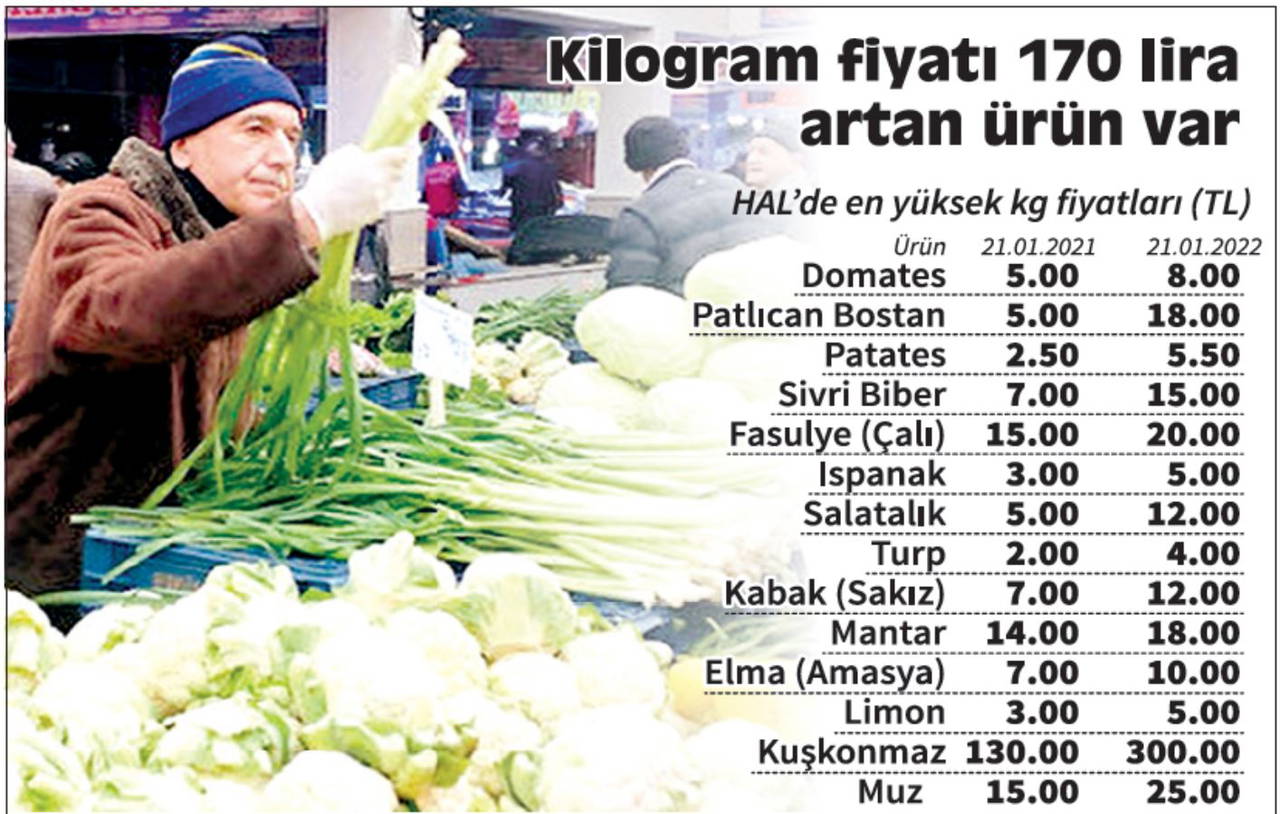 Kurdaki düşüşe rağmen gıda ürünlerinin fiyatlarında düşüş yaşanmadı. Çünkü tarımdaki girdi fiyatları sürekli artıyor. Hal böyle olunca halkın temel gıda ürünlerine ulaşması da zorlaşıyor. Üreticiden tüketiciye kadarki halkada ürün fiyatları ise beşe altıya katlanıyor. Sebze ve meyvede hal fiyatlarındaki fahiş oranlardaki zamları İstanbul Büyükşehir Belediyesi Hal Müdürlüğü’nün 21.01.2021 ve 21.01.2022 tarihleri arasındaki fiyat değişimlerine bakarak derledik.