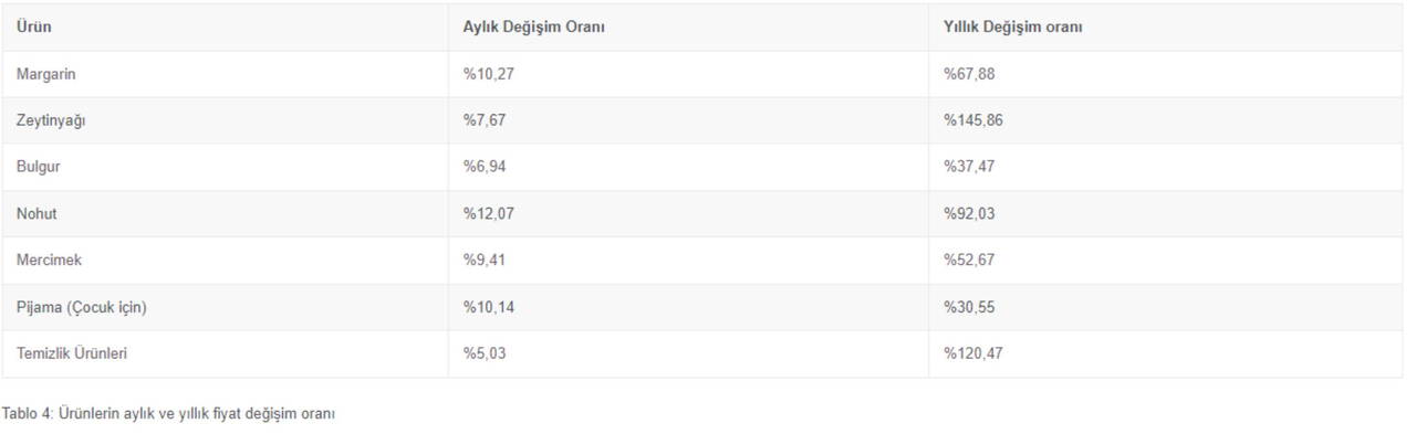 Hanelerin sık kullandığı bazı ürünlerin bir önceki yılın Ekim ayına göre fiyat artışlarına bakıldığında en çarpıcı fiyat artışı zeytinyağında yaşandı. Zeytinyağı fiyatı bir önceki yıla göre yüzde 145,8 artış gösterdi.