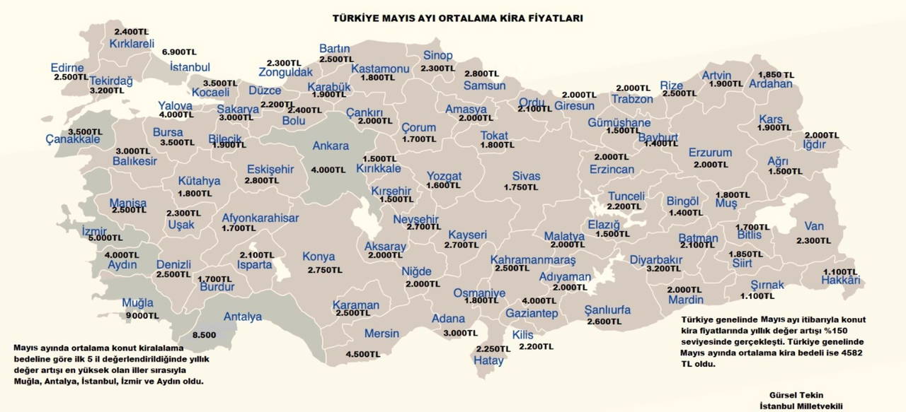 CHP İstanbul Milletvekili Gürsel Tekin, internette yer alan emlak sitelerindeki kiralık ilanları üzerinden yaptığı değerlendirmede 81 ilin kiralık konut haritasını çıkarttı.