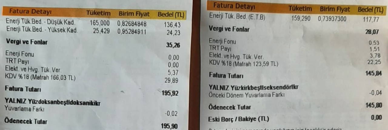 Gelen faturalara göre bazı ailelerin faturalarında 50, bazı ailelerin faturalarında da 100 liraya yakın artış oldu. Çalıştıkları için gündüzleri evde olmayan, tek çocukları da okulda bulunan bir ailenin geçen ayki fatura tutarı 145.80 liraydı. Ailenin 7 Aralık ile 8 Ocak arasını kapsayan 33 günlük yeni faturası ise 195.92 TL olarak geldi. Bu ailenin 33 günlük elektrik tüketimi 190,429 kWh oldu.