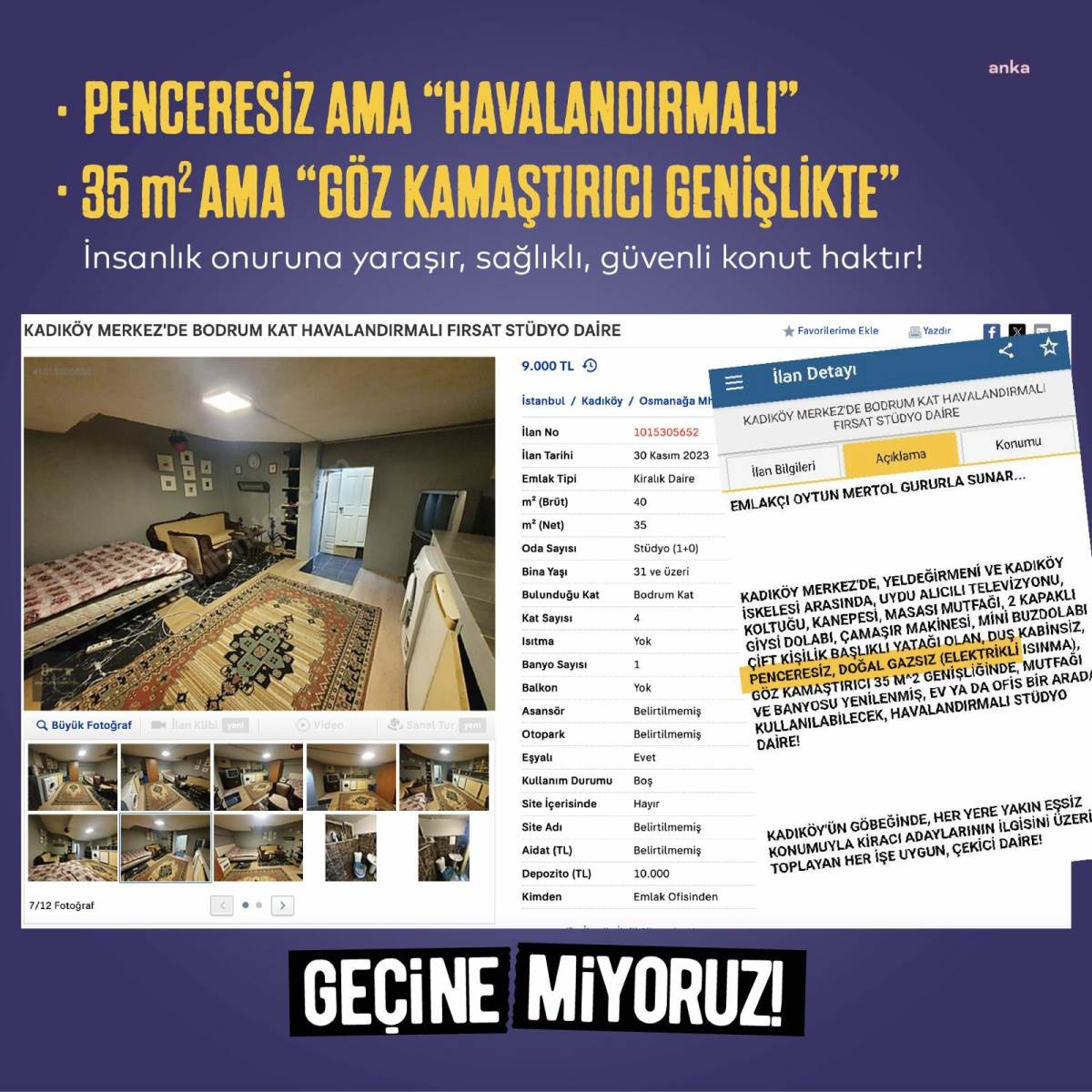 Kiralık daire ilanları fiyat aralıklarına dağıtıldığında görülen tablo her geçen ay daha fazla kötüleşmeye devam ediyor. Asgari ücretlilerin maaşlarının tamamıyla dahi ev kiralaması bir süredir imkansız hale gelmişti. Asgari ücretin altında fiyatları 8 bin 500 TL ile 10 bin TL arasında toplam 6 adet kiralık daire ilanı bulunmakta. Bu 6 kiralık daire ilanından 3’ü niteliksiz 1 artı 0 (Stüdyo) dairelerden oluşurken, 2 tanesi ise kentsel dönüşüm sorunları ile boğuşan Fikirtepe’de bulunuyor. Mevcut bu 6 ilanın hiçbiri insanlık onuruna yaraşır, sağlıklı, güvenli konuttan oluşmuyor. İlanlardan bir tanesi ise yaşamaya elverişsizlik konusunda diğerlerinden oldukça fazla ayrılıyor. Bodrum katta, penceresiz olan ilan 'havalandırmalı' 'Göz kamaştırıcı 35 m2 genişliğinde' ifadeleriyle 9 bin TL bedelle kiralanmak isteniyor.
