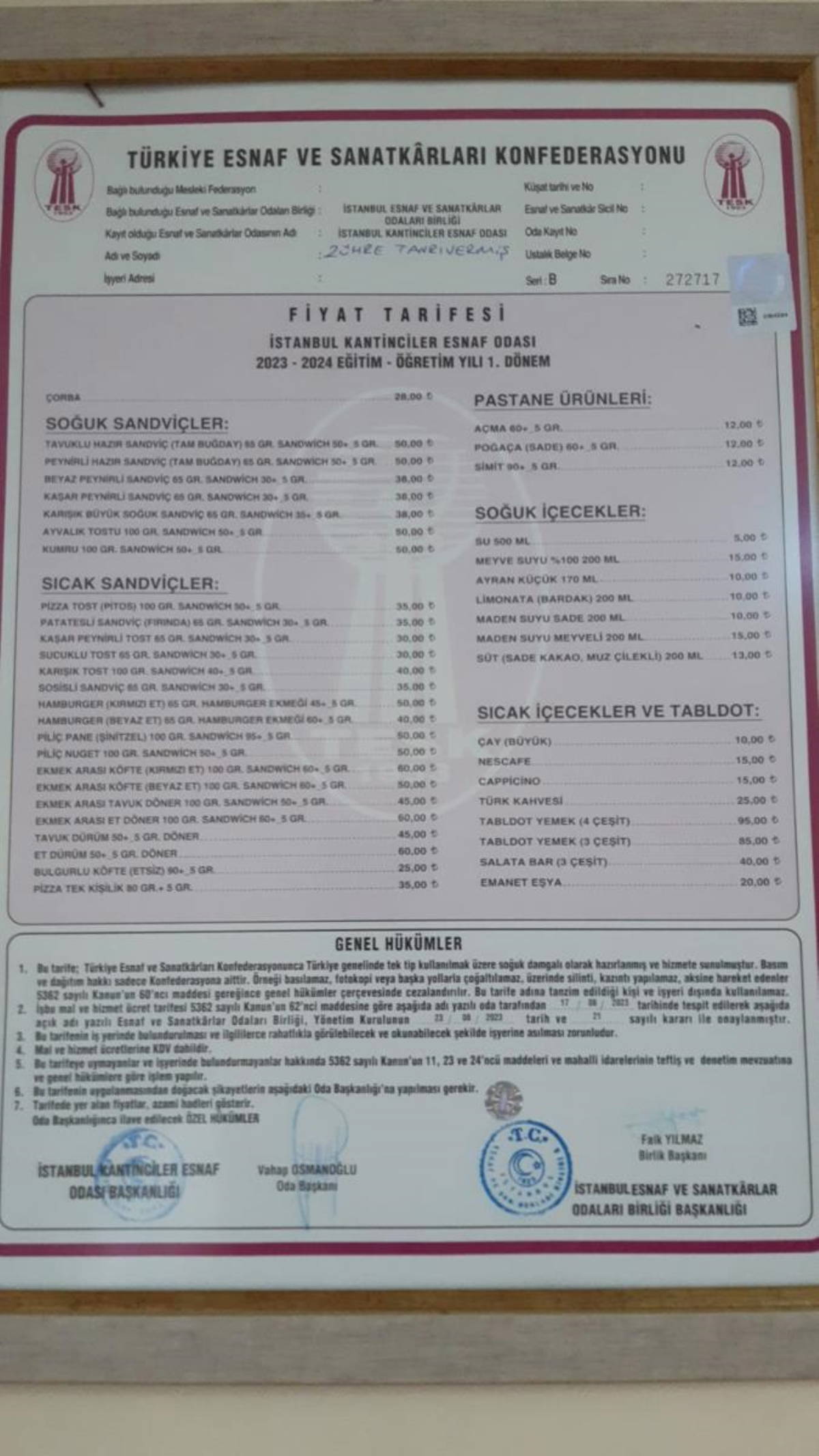 İstanbul Kantinciler Esnaf Odası, 2023-24 eğitim öğretim yılı 1. dönemine ilişkin fiyat tarifesini yayımladı.