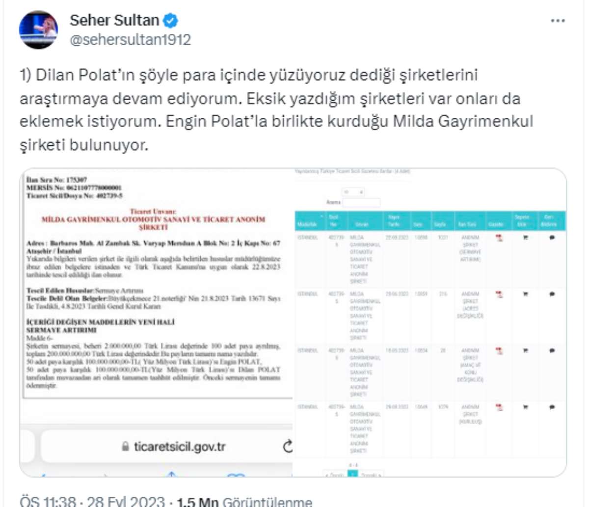 ”Dilan Polat’ın şöyle para içinde yüzüyoruz dediği şirketlerini araştırmaya devam ediyorum. Eksik yazdığım şirketleri var onları da eklemek istiyorum. Engin Polat’la birlikte kurduğu Milda Gayrimenkul şirketi bulunuyor.