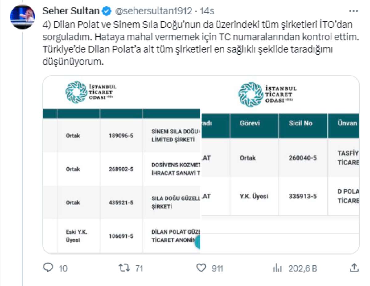 Dilan Polat ve Sinem Sıla Doğu’nun da üzerindeki tüm şirketleri İTO’dan sorguladım. Hataya mahal vermemek için TC numaralarından kontrol ettim. Türkiye’de Dilan Polat’a ait tüm şirketleri en sağlıklı şekilde taradığımı düşünüyorum.