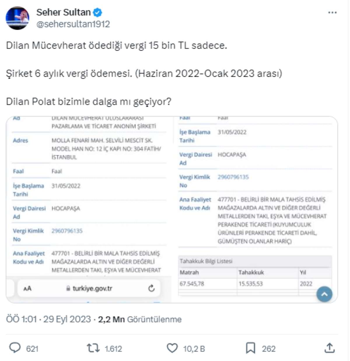 Gazeteci Seher Yaşayacak, "eşiyle birlikte kara para akladıkları" iddia edilen Dilan Polat'ın şirketlerinden "Dilan Mücevherat"ın 6 aylık vergi ödemesinin 15 bin 535 lira olduğunu söyledi.