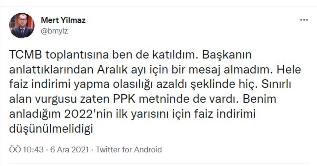 Konuya ilişkin toplantıya katılan İnfo Yatırım Genel Müdür Yardımcısı Mert Yılmaz, ''TCMB toplantısına ben de katıldım. Başkanın anlattıklarından aralık ayı için bir mesaj almadım. Hele faiz indirimi yapma olasılığı azaldı şeklinde hiç. Sınırlı alan vurgusu zaten PPK metninde de vardı. Benim anladığım 2022'nin ilk yarısını için faiz indirimi düşünülmediği'' ifadelerini kullandı.
