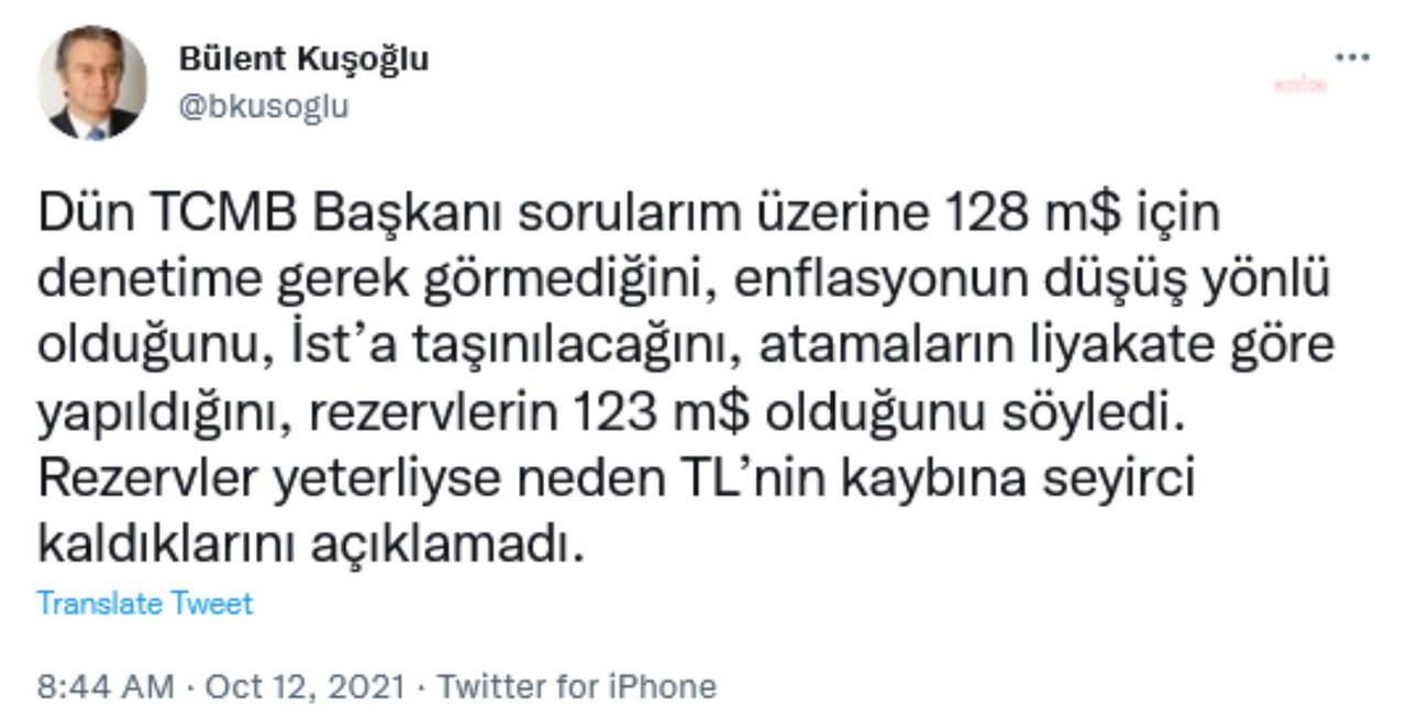 "Dün Merkez Bankası Başkanı, sorularım üzerine 128 milyar dolar için denetime gerek görmediğini, enflasyonun düşüş yönlü olduğunu, İstanbul’a taşınılacağını, atamaların liyakate göre yapıldığını, rezervlerin 123 milyar dolar olduğunu söyledi. Rezervler yeterliyse neden TL’nin kaybına seyirci kaldıklarını açıklamadı."