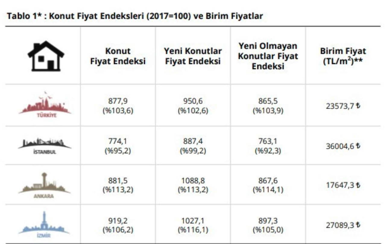 Endeks değerleri geçen yılın aynı ayına göre ise İstanbul'da yüzde 95,2, Ankara'da yüzde 113,2 ve İzmir'de 106,2 yükseldi.