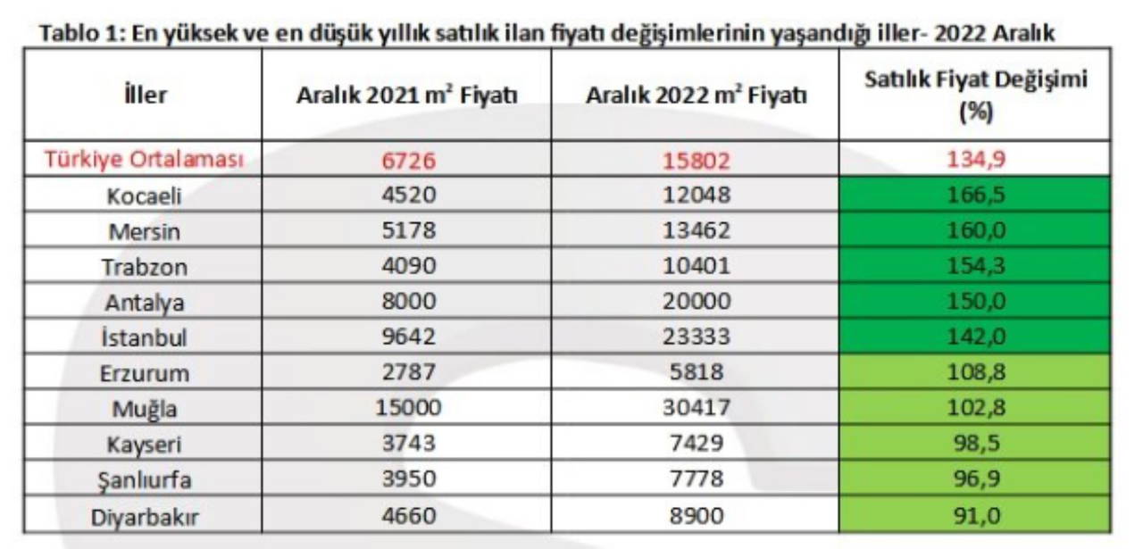 Rapora göre, ülke genelinde ortalama satılık konut ilan metrekare cari fiyatı 2022 Aralık’ta bir önceki yılın aralık ayına göre yüzde 134,9 artarak 15 bin 802 TL’ye çıktı.