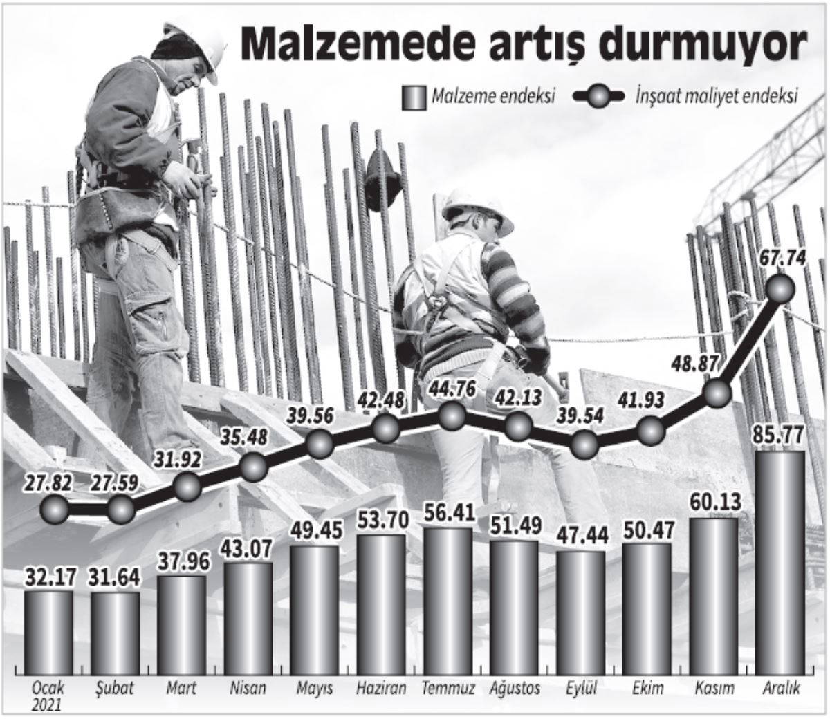 Türkiye Cumhuriyet Merkez Bankası'nın 2021 Kasım ayı Konut Fiyat Endeksi'ne göre konut fiyatları yıllık yüzde 50.5 artış gösterdi. Emlak sektör temsilcilerine göre ise bu artış yüzde 100'ü geçmiş durumda. Türkiye İstatistik Kurumu'nun Kasım 2021 İnşaat Maliyet Endeksi yıllık yüzde 48.87. Buna karşılık inşaat sektörü temsilcileri konut üretim maliyetinin yıllık yüzde 200 arttığını söylüyor. Sektör temsilcileri müteahhitler için konut yapmanın zorlaştığını, birikimi olmayan yurttaşlar için ise sıfırdan konut almanın imkansız olduğunu vurgularken, 2022'de fiyatların en az yüzde 60 daha artacağını açıkladı.