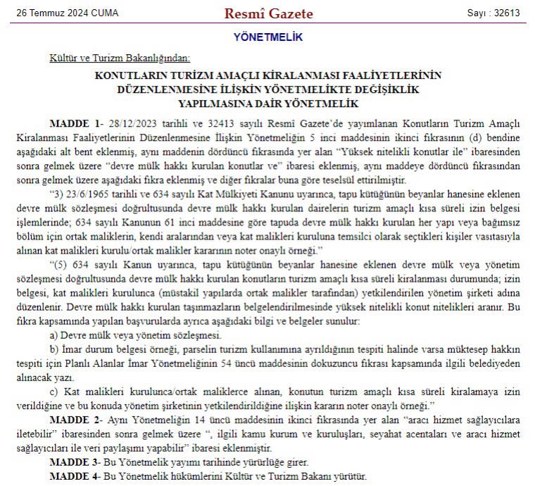 Buna göre, 28/12/2023 tarihli ve 32413 sayılı Resmî Gazete’de yayımlanan Konutların Turizm Amaçlı Kiralanması Faaliyetlerinin Düzenlenmesine İlişkin Yönetmeliğin 5 inci maddesinin ikinci fıkrasının (d) bendine aşağıdaki alt bent eklenmiş, aynı maddenin dördüncü fıkrasında yer alan “Yüksek nitelikli konutlar ile” ibaresinden sonra gelmek üzere “devre mülk hakkı kurulan konutlar ve” ibaresi eklendi.
