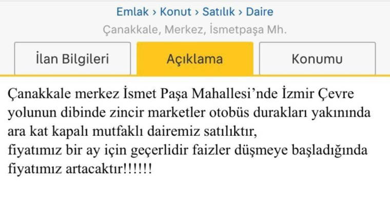 İlanın açıklamasdaki "Fiyatımız bir ay için geçerlidir, faizler düşmeye başladığında fiyatımız artacaktır" ifadesi dikkat çekti.
