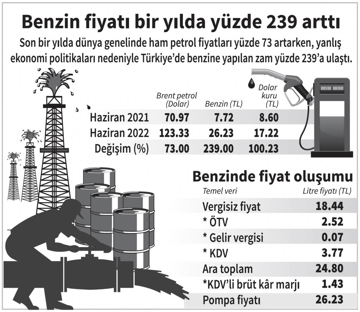 Bütün dünyada artan petrol fiyatları, AKP iktidarının uyguladığı yanlış politikalarla Türkiye’de yaşanan krizin etkilerini daha da derinleştirdi. Bir yıl içinde yüzde 239 artan benzin fiyatı, gıdadan ulaşıma kadar birçok kalemde maliyet artışına sebep oldu ve enflasyonu körükledi.