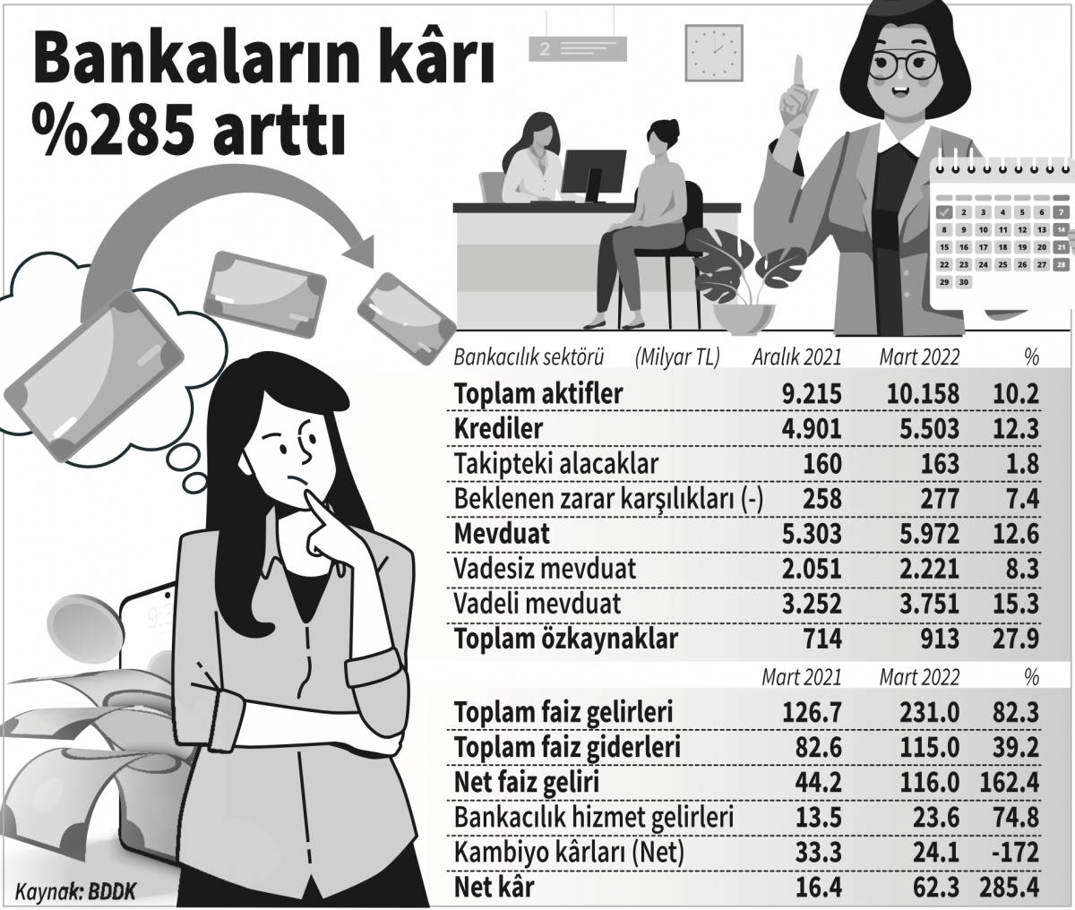 Toplam varlıklarını 9.2 trilyon TL’den 10.1 trilyon TL’ye çıkaran bankalar net kârlılıkta ise patlama yaptı. 2021’in ilk çeyreğinde 16.4 milyar TL net kâr açıklayan sektör, 2022’nin ilk çeyreğinde yüzde 285 büyüme ile 63.2 milyar TL kâr elde etti. Bankaların 2021’de yıllık bazda 92.9 milyar TL kâr açıkladığı düşünüldüğünde bir yılda ettiği kârın yüzde 68’ini üç ayda yapması dikkat çekti.