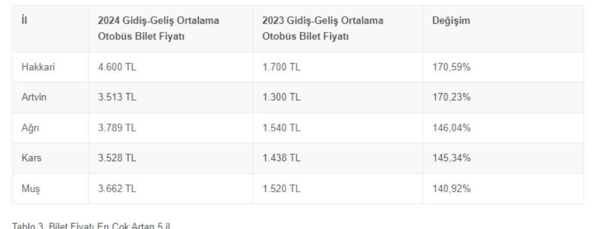 OTOBÜS BİLET FİYATI EN FAZLA ARTAN İL HAKKARİ