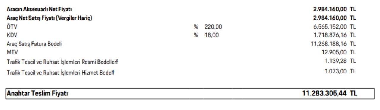 Fosil yakıtlı lüks segmette yer alan 2000cc üzeri motora sahip otomobil ve SUV'larda alınan yüzde 220 ÖTV ve bu meblağın üzerinden alınan yüzde 18 KDV ile aracın üzerindeki vergi yükü toplam yüzde yüzde 277.60'a ulaşıyor. Bu araçlara rakip olabilecek şekilde tasarlanan elektrikli benzer modellerde ise vergi yükü yüzde 10 veya 20 gümrük vergisi, yüzde 60 ÖTV ve yüzde 18 KDV ile toplam yüzde 126.56 oluyor.