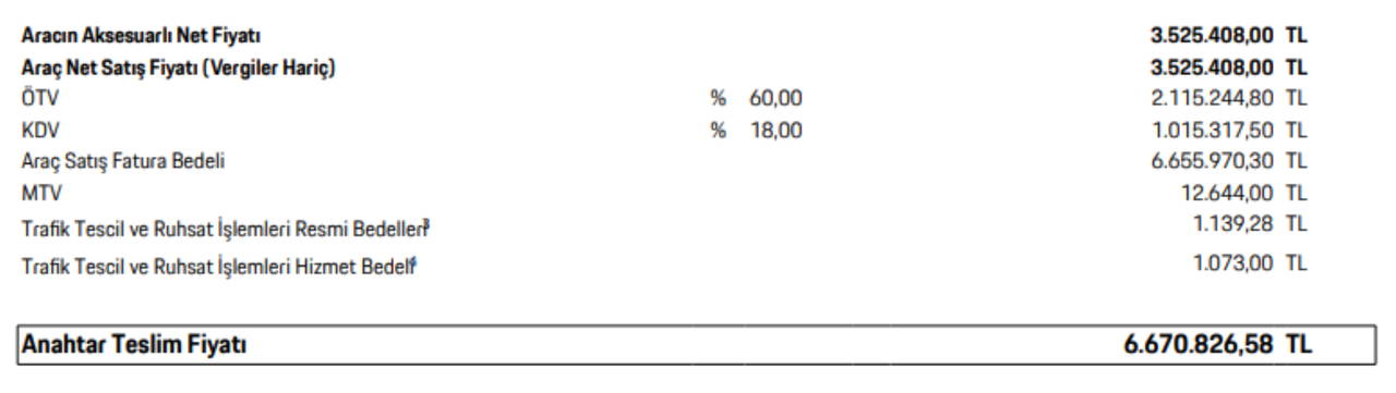 Porsche Taycan 4S ise standart donanım ile 2 milyon 596 bin 378 TL'ye satılırken yine eklenen bazı donanımlar ile 3 milyon 525 bin 408 TL'ye çıkan örneğimizin vergilerin ardından 6 milyon 670 bin 826 TL'ye satıldığı görülüyor.