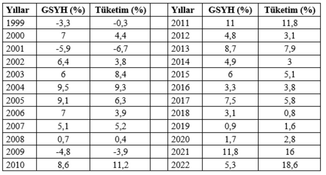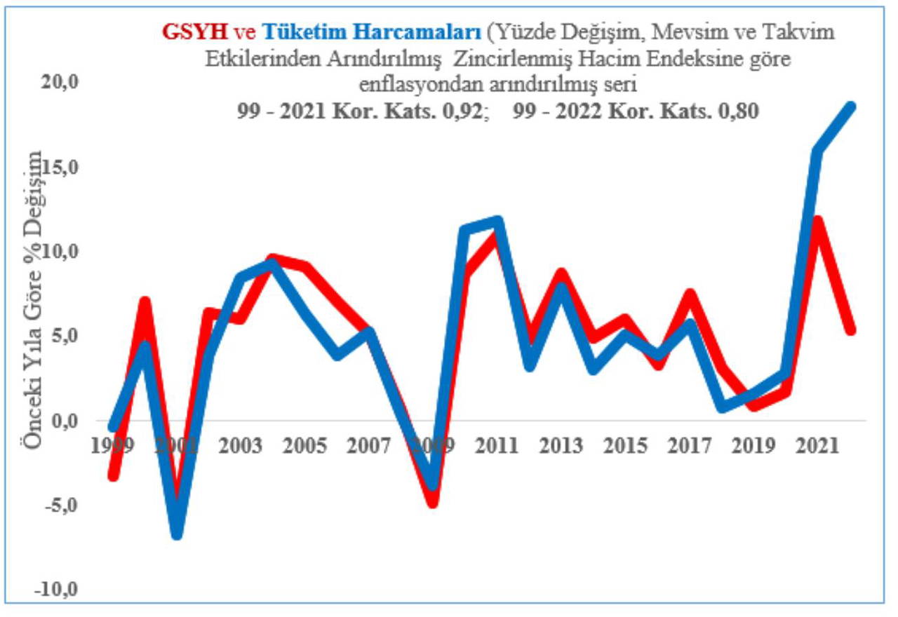 Grafiğe göre 1999 ile 2021 yılları arası esas alındığında GSYH ve tüketim harcamalarının bir önceki yıla göre artışları arasında 0,92 ile ölçülebilen bir korelasyon katsayısı[ii] görülüyor. Yani tüketim harcamaları, gelirdeki artışa paralel ve çok yakın bir yol izlemiş, onunla birlikte artmış bulunuyor. Buna karşılık bu seriye 2022 yılını eklediğimizde görünüm değişiyor, GSYH’nin artış hızı bir önceki yıla göre ciddi bir düşüş sergilemesine karşılık tüketim harcamalarının artış hızı bir önceki göre önemli bir artış gösteriyor. Yalnızca 2022 yılının seriye eklenmesinin etkisiyle GSYH artış hızı ve tüketim harcaması artış hızı arasındaki korelasyon katsayısı 0,80’e düşüyor.