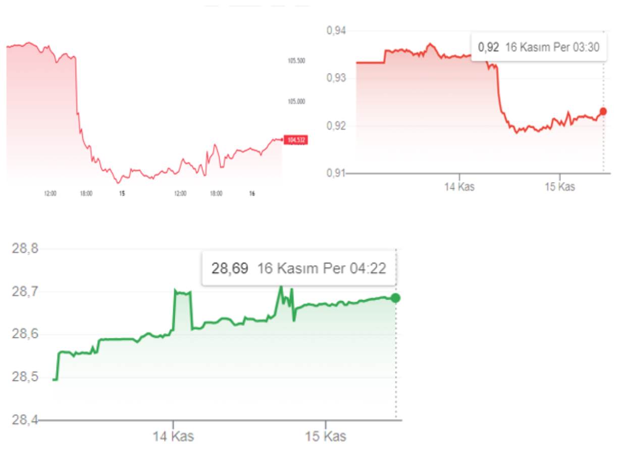 Son beş günde Dolar Endeksi (ABD Dolarının beş büyük ticaret ortağının paralarına karşı endeks değeri, aşağıda soldaki grafik) ve doların Euro karşısındaki değeri (aşağıda sağdaki grafik) düşüş içinde. Bir başka ifadeyle dolar, son günlerde bütün paralara karşı değer kaybediyor. Bunun birkaç istisnası var. Onlardan birisi olan TL, değer kaybeden dolara karşı değer kaybetmeye devam ediyor (en alttaki grafik.)