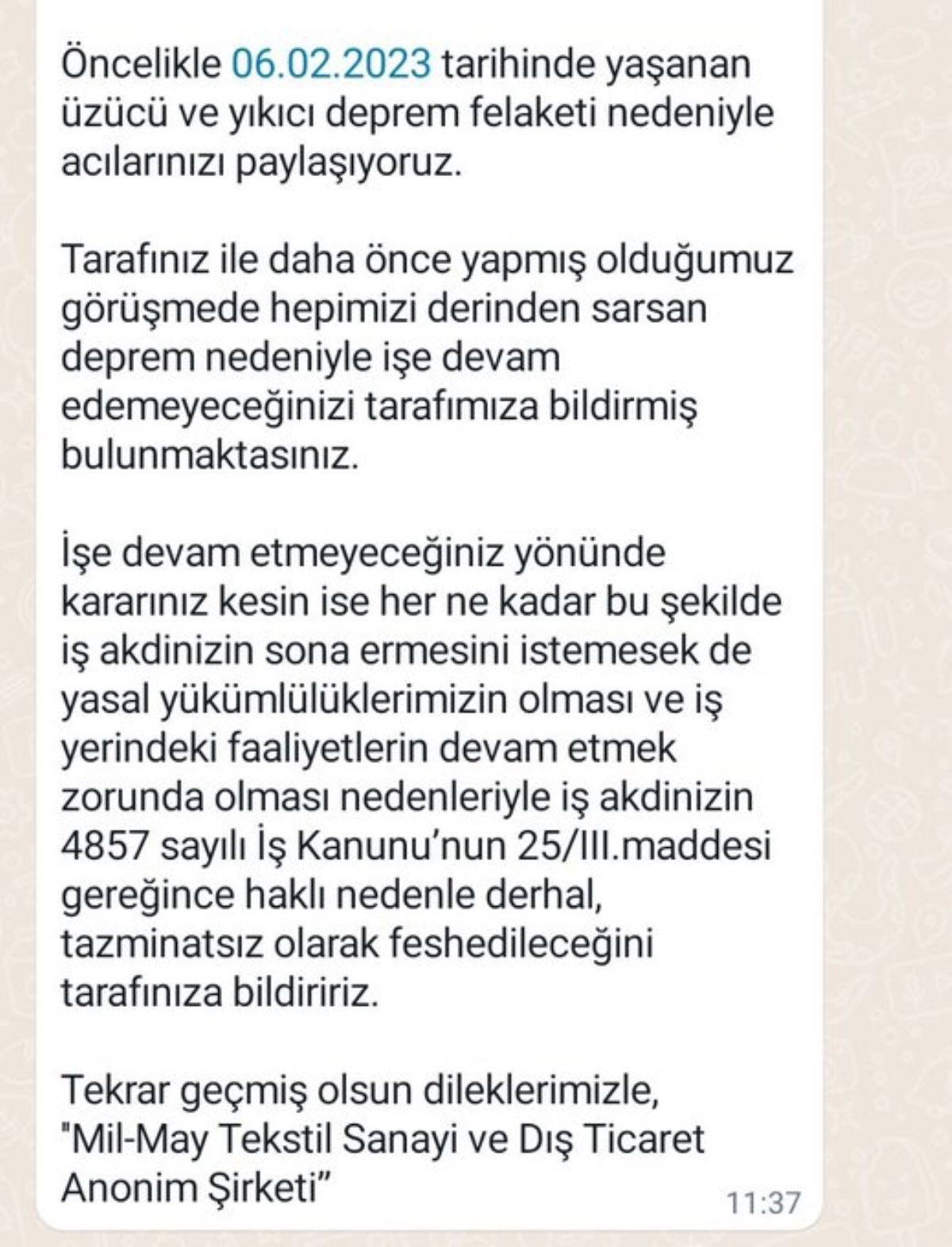 İşçilere gönderilen mesajı Twitter hesabından paylaşan Türkmen, söz konusu mesaja “Malatya’daki Mil-May Tekstil adlı fabrikanın, ‘Evimiz yıkıldı’, ‘Yakınlarımızı kaybettik’, ‘Bu halde işe nasıl gelelim’ diyen işçilere gönderdiği mesaj. İş akdiniz derhal, tazminatsız feshedilecek! Öyle mi Mil-May patronu? Bu da BİRTEK-SEN’in size mesajı: Hele bir deneyin” notunu ekledi.