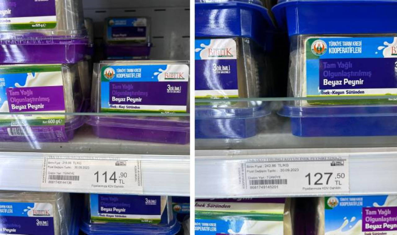 15 TL’ye satılırken indirim çağrısıyla birlikte fiyatı 14.50 TL’ye düşen makarna, bugün yeniden 15 TL oldu. 20.90 TL’ye satılırken çağrıyla birlikte 20.40 TL’ye düşürülen 1 litre süt, ambalaj değişikliği geçirerek bugün 23.50 TL’ye çıktı.