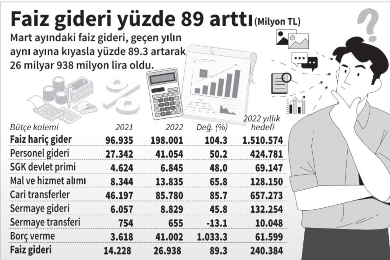Buna göre mart ayında 2021 yılı mart ayına kıyasla bütçe geliri yüzde 15.6 artarak 156 milyar lira, gider yüzde 102.3 artarak 224.9 milyar lira ve açık 69 milyar lira oldu. Bütçe geçen yılın mart ayında 23.8 milyar lira fazla vermişti. Faiz dışı denge ise Mart 2022’de 42 milyar lira açık olarak gerçekleşti. Yine martta faiz giderleri yüzde 89.3 artışla 26.9 milyar lira, vergi gelirleri yüzde 64.5 artışla 127.4 milyar lira oldu. İlk üç ayda ise gelir yüzde 75.1 artışla 602.5 milyar lira, gider yüzde 77.9 artışla 571.5 milyar lira ve bütçe fazlası 30.8 milyar lira oldu. Diğer detaylar ise şöyle: