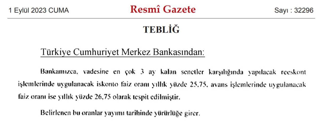 Resmi Gazete'de yayımlanan tebliğe göre, vadesine en çok 3 ay kalan senetler karşılığında yapılacak reeskont işlemlerinde uygulanacak iskonto faiz oranı yıllık yüzde 25,75 oldu. Avans işlemlerinde uygulanacak faiz oranı ise yıllık yüzde 26,75 olarak tespit edildi.