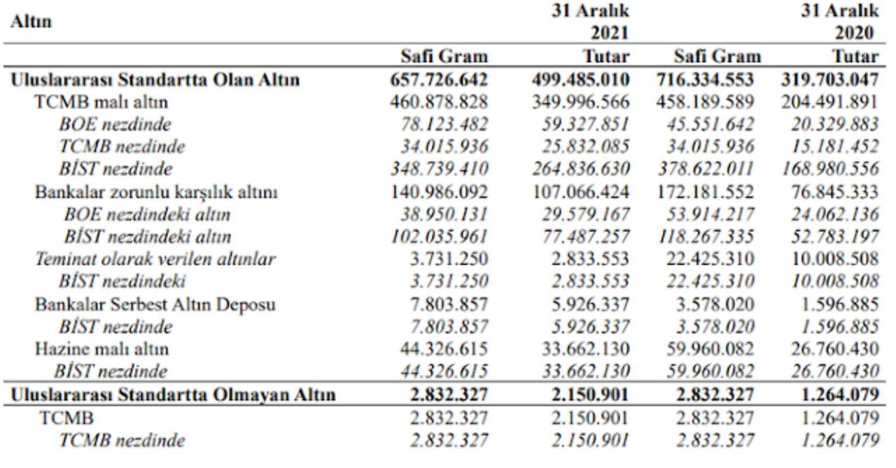 Uluslararası altın ağırlığı ölçüsü olarak troy ons (31,1 gram) kullanılıyor.  Buna göre yaklaşık toplam 658 milyon gram tutarındaki altın 21,2 milyon ons ediyor. Bu toplamın 3,8 milyon onsu (2,5 milyon onsu TCMB’ye, 1,25 milyon onsu da bankalara ait)  İngiltere Merkez Bankasında saklanıyor (bu altınların orada bulunmasının amacı swap işlemi yapabilmek.)  Bugün itibarıyla altının ons fiyatı 1.846 dolar. Buna göre TCMB’nin rezervlerinde ye alan ve İngiltere Merkez Bankası’nda tutulan altın miktarının piyasa değeri (3,8 milyon ons x 1.846 USD =) 7 milyar dolar ediyor.