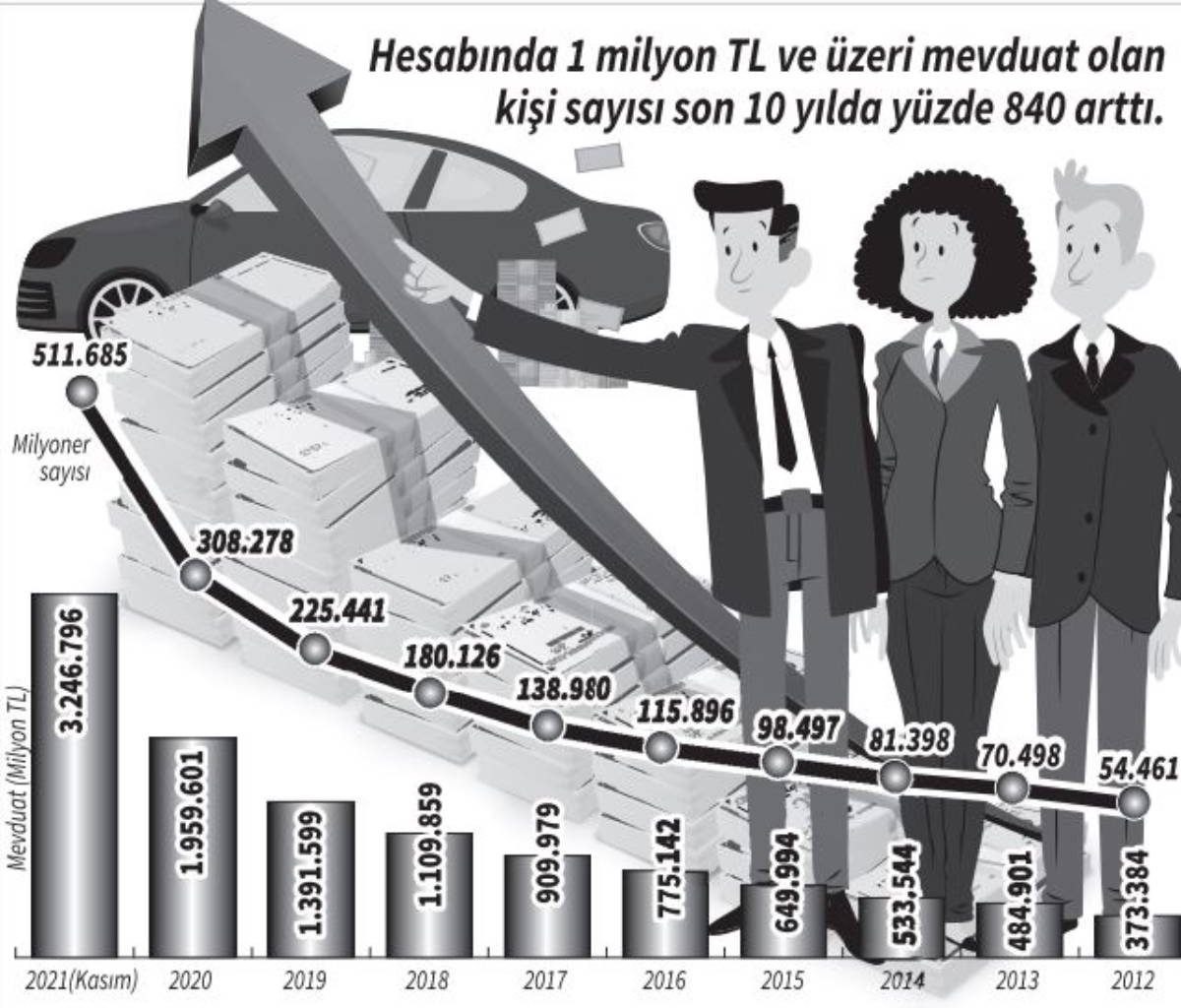 Kriz, pahalılık, pandemi ile geçen 2021’de milyoner sayısında da patlama yaşanıyor. Hesabında 1 milyon TL ve üzeri mevduat olan mudi sayısı son bir yılda 202 bin kişilik artışla 511 bin 685’e yükseldi. Geçen yıl aynı dönemde bu sayı 309 bin 730 kişiydi.