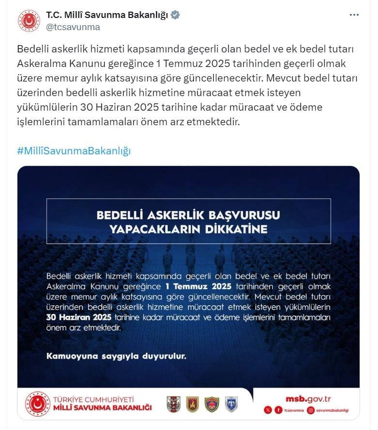 Bakanlığın sosyal medya hesabından yapılan açıklamada, bedelli askerlik hizmeti kapsamında geçerli olan bedel ve ek bedel tutarının Askeralma Kanunu gereğince 1 Temmuz 2025 tarihinden itibaren memur aylık katsayısına göre güncelleneceği belirtildi. Mevcut bedel üzerinden başvuruda bulunmak isteyenlerin 30 Haziran 2025 tarihine kadar müracaat ve ödeme işlemlerini tamamlamaları gerektiği vurgulandı.