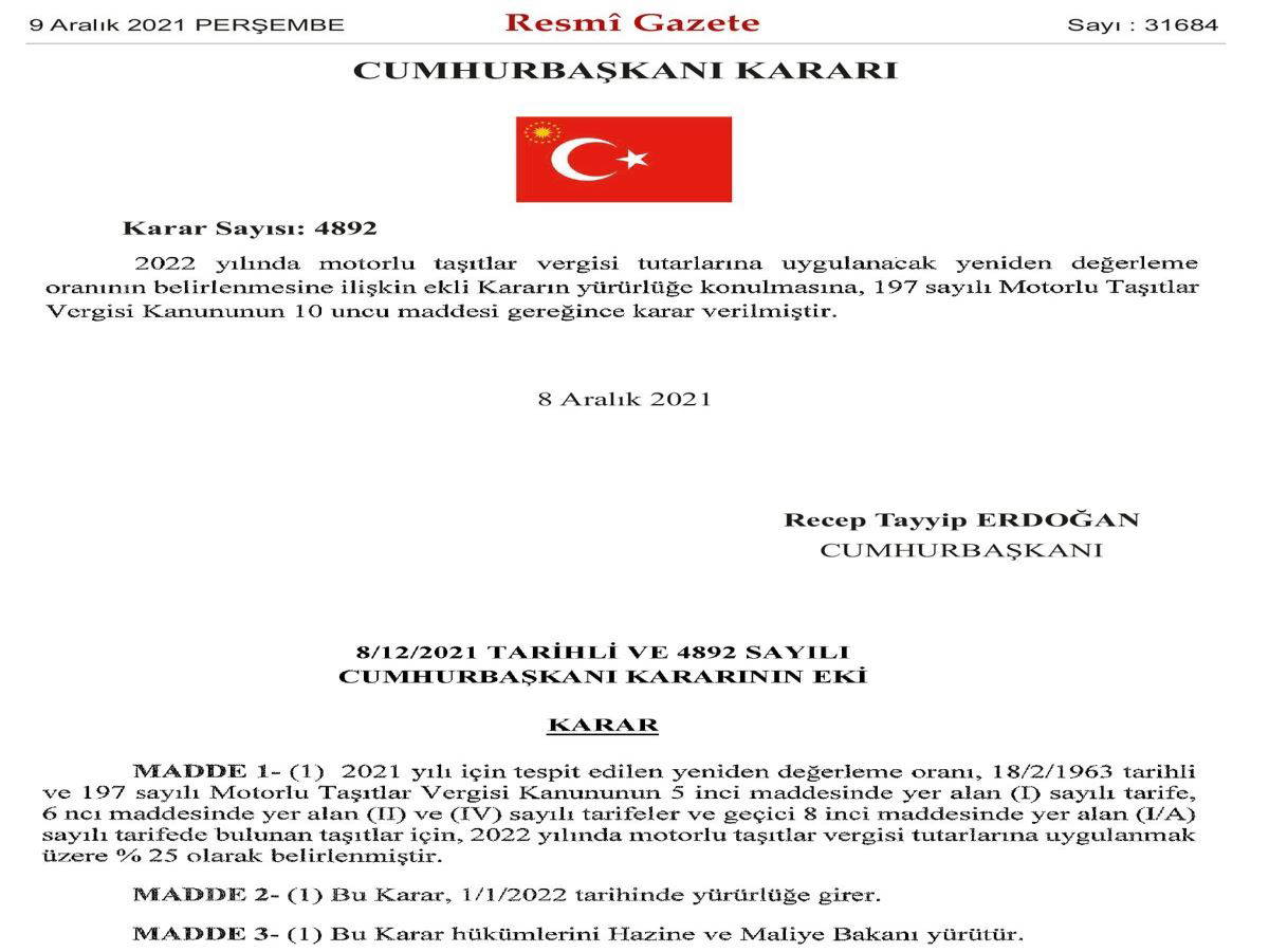 Motorlu taşıtlar vergisinde (MTV) 2022 yılında uygulanacak yeniden değerleme oranı yüzde 25 olarak yeniden belirlendi