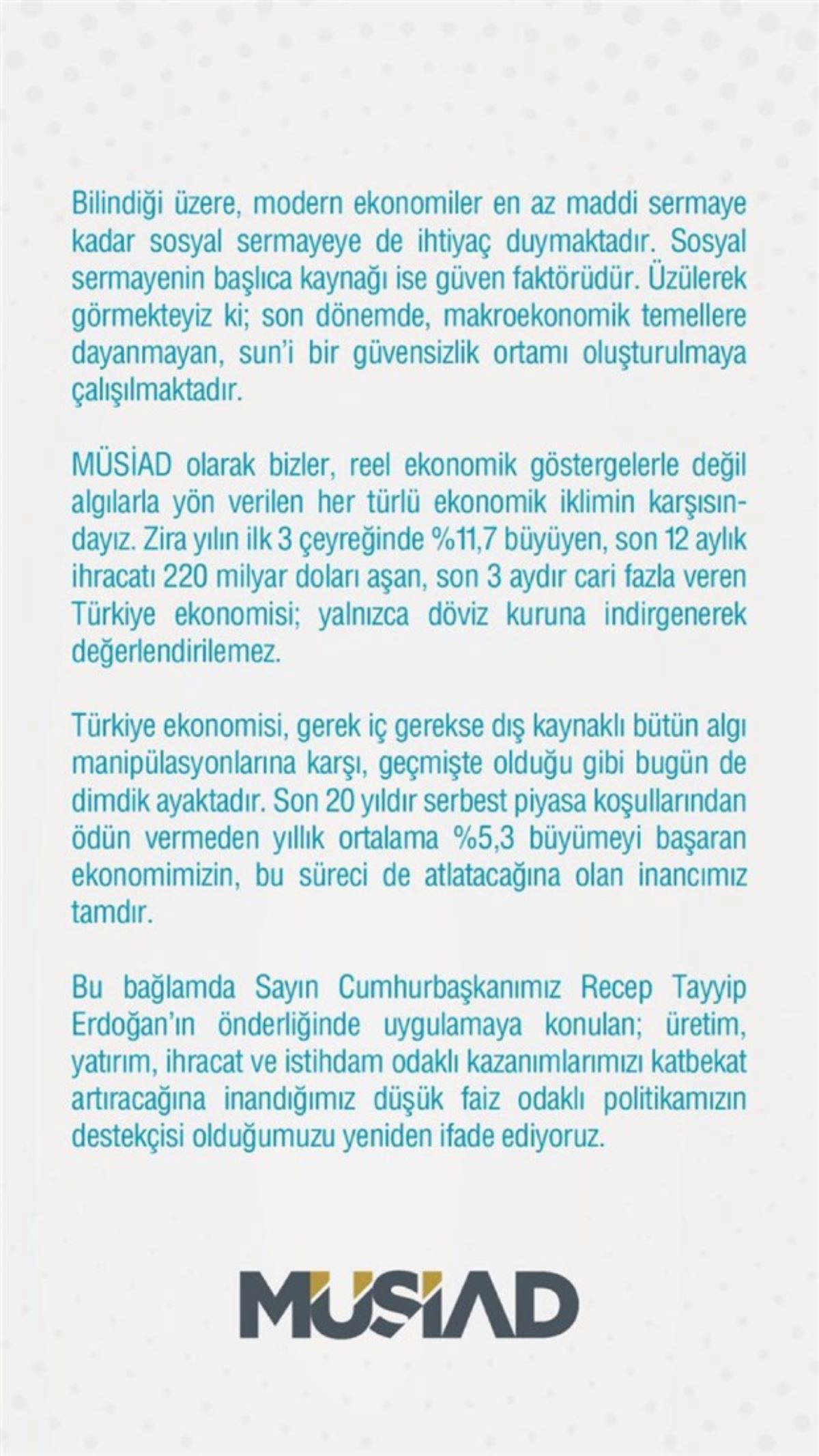 Müstakil Sanayici ve İşadamları Derneği'nden (MÜSİAD) yapılan açıklamada, "Son dönemde makroekonomik temellere dayanma suni bir güvensizlik ortamı oluşturulmaya çalışılmaktadır. Son 20 yıldır serbest piyasa koşullarından ödün vermeden yıllık yüzde 5,3 büyümeyi başaran ekonomimizin, bu süreci de atlatacağına olan inancımız tamdır" denildi.