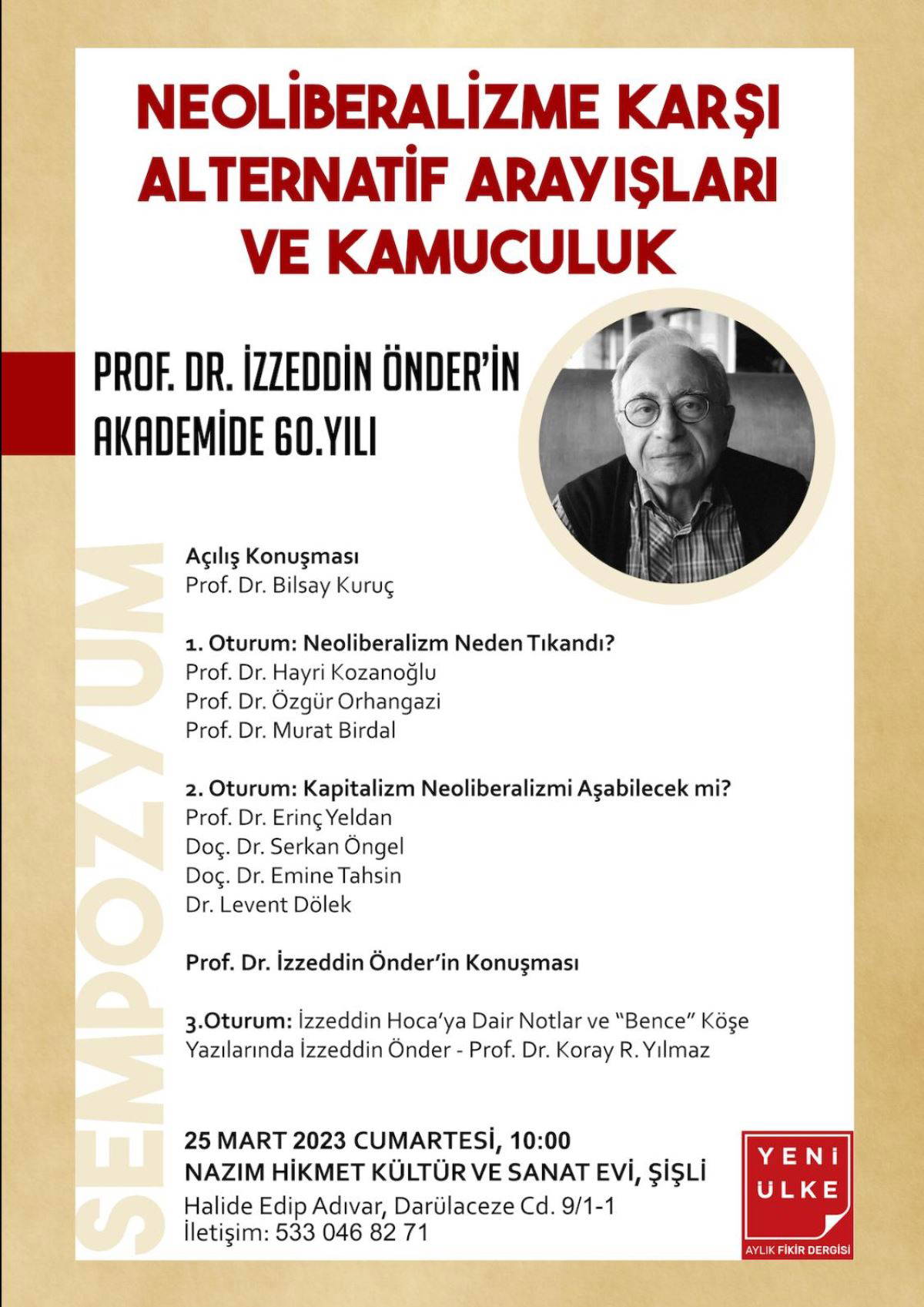Yeni Ülke’nin Twitter hesabından yayımlanan mesajda ise “Yeni Ülke Dergisi olarak Prof. Dr. İzzeddin Önder’in akademideki 60. yılı vesilesiyle düzenlediğimiz ‘Neoliberalizme Karşı Alternatif Arayışları ve Kamuculuk’ başlıklı sempozyuma tüm dostlarımız davetlidir” denildi.