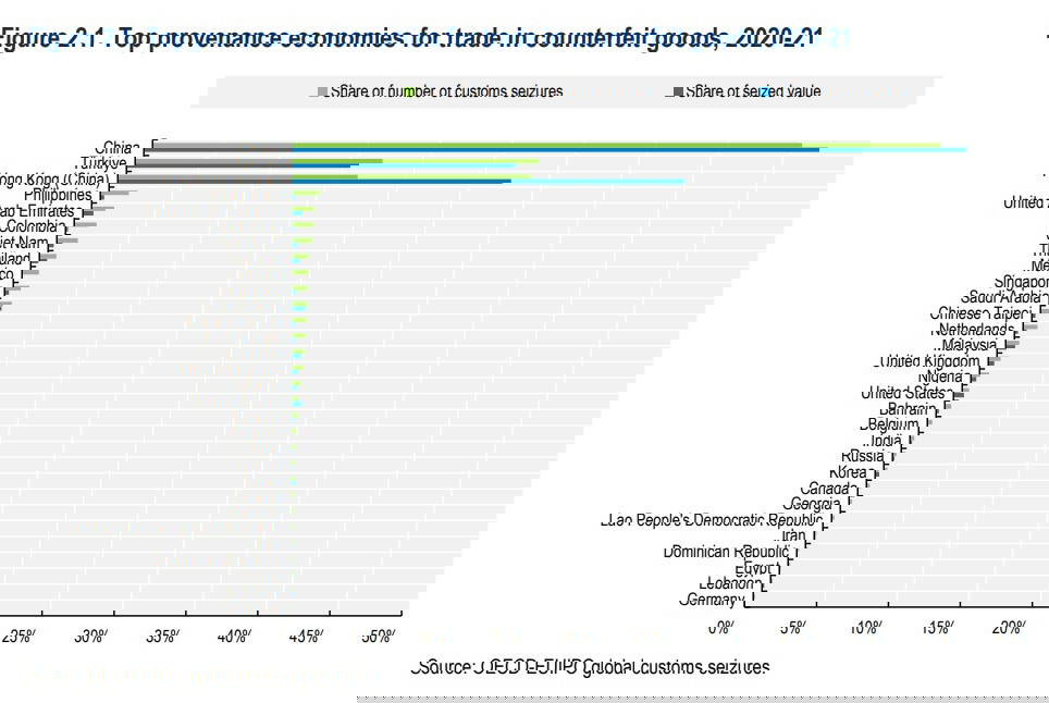 Çin hâlâ küresel sahte ürün ticaretinin lideri konumunu koruyor ve tüm dünyada el konulan sahte ürünlerin yüzde 45’i Çin menşeli. Ancak, Türkiye’nin sıralamadaki yeri ilginç bir şekilde değişim gösterdi. Türkiye, önceki yıllarda daha üst sıralarda yer alırken, son verilerde 2021’de ele geçirilen sahte malların payında bir düşüş olduğu görüldü. Buna karşın, Çin ve Hong Kong’un bu alandaki payları artmış durumda. Türkiye’nin, coğrafi konumu ve modern lojistik altyapısı, sahte ürünlerin transit geçişi için tercih edilen bir ülke olmasına yol açıyor.