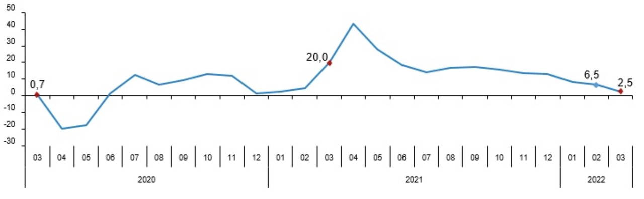 Cari fiyatlarla perakende ciro 2022 yılı mart ayında bir önceki yılın aynı ayına göre yüzde 90,5 arttı. Aynı ayda gıda, içecek ve tütün satışları yüzde 80,8, gıda dışı satışlar (otomotiv yakıtı hariç) yüzde 79,2, otomotiv yakıtı satışları yüzde 150,5 arttı.
