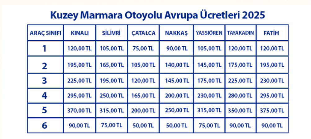 - Kuzey Marmara Avrupa Otoyolu: 172 TL
