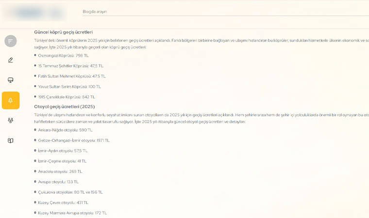 2025 yılı itibarıyla köprülerde uygulanacak zamlı geçiş ücretleri şu şekilde olacak: