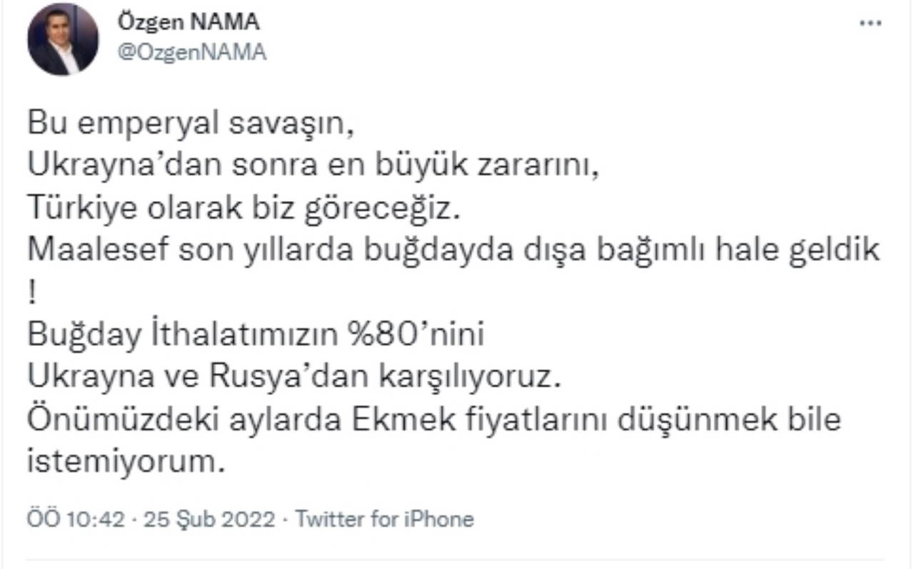Nama, Twitter hesabından yaptığı paylaşımda "Bu emperyal savaşın, Ukrayna’dan sonra en büyük zararını, Türkiye olarak biz göreceğiz. Maalesef son yıllarda buğdayda dışa bağımlı hale geldik ! Buğday ithalatımızın %80’ini Ukrayna ve Rusya’dan karşılıyoruz. Önümüzdeki aylarda ekmek fiyatlarını düşünmek bile istemiyorum" ifadelerini kullandı.