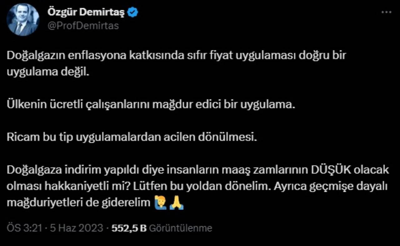 "Doğalgazın enflasyona katkısında sıfır fiyat uygulaması doğru bir uygulama değil. Ülkenin ücretli çalışanlarını mağdur edici bir uygulama. Ricam bu tip uygulamalardan acilen dönülmesi. Doğalgaza indirim yapıldı diye insanların maaş zamlarının düşük olacak olması hakkaniyetli mi? Lütfen bu yoldan dönelim. Ayrıca geçmişe dayalı mağduriyetleri de giderelim."