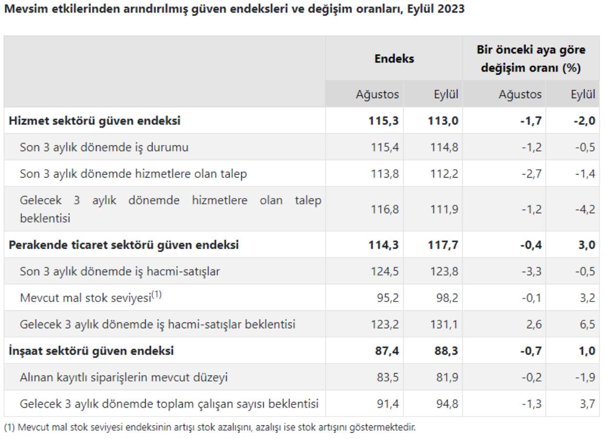 Buna göre, mevsim etkilerinden arındırılmış güven endeksi eylül ayında bir önceki aya göre; hizmet sektöründe yüzde 2 oranında azalarak 113,0 değerine geriledi.